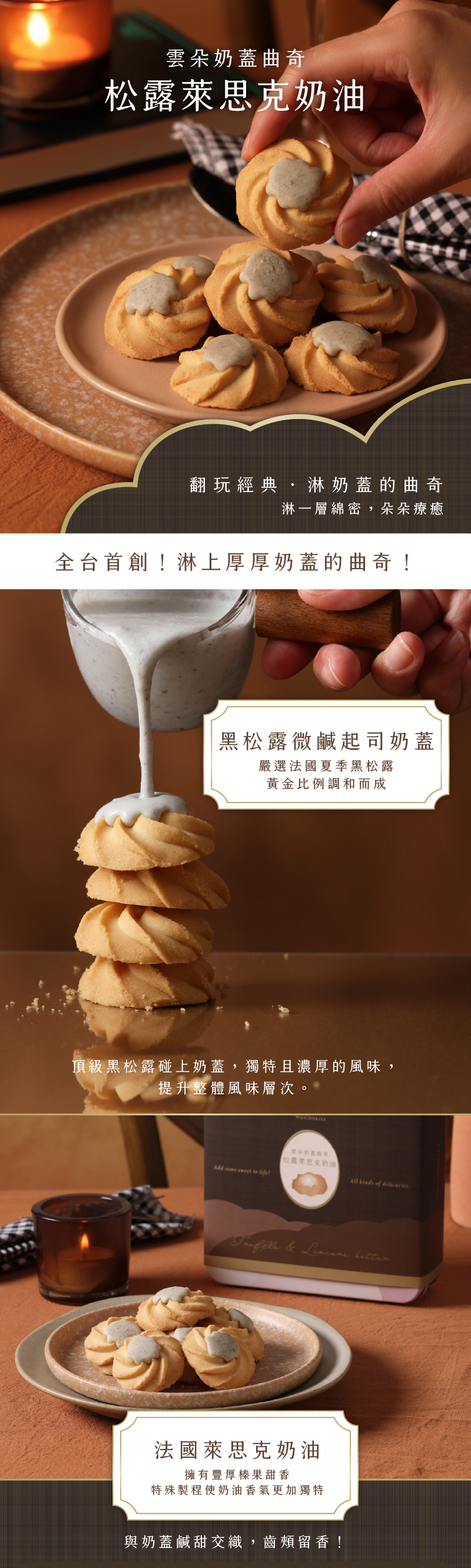 ※ 因運送過程如導致曲奇粉末沾黏到淋醬表面屬正常情形,請安心食用。 ※ 曲奇口感極致酥鬆,出貨前我們必確保餅乾的完整性,並特別提醒配合的貨運公司小心輕放。運送過程不免會發生外力碰撞,如有不周敬請見諒。若您非常介意產品收到時的完整性,請斟酌下單!因超商取貨運送過程不可控因素較高,較有可能造成餅乾碎裂之情形,送貨方式建議選擇「黑貓宅急便」宅配。 ※ 存放於陰涼乾燥處即可,開封後請盡快食用完畢。雲朵奶蓋為特製比例而成的微鹹起司巧克力奶蓋,如遇環境過熱較易融化。為獲得最佳風味和口感,夏季品嚐建議收到後先置於約20度的室溫一段時間後再享用。 |