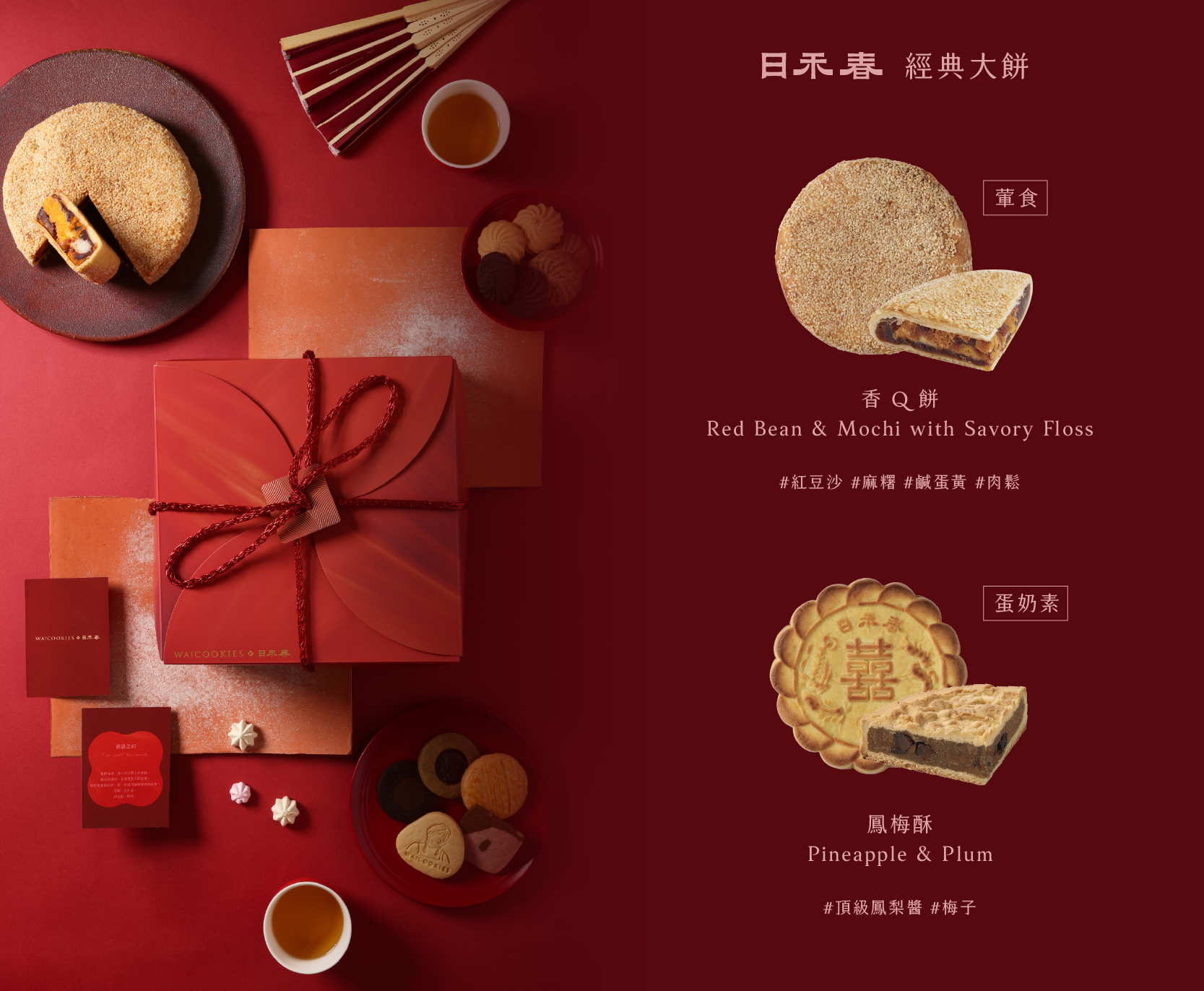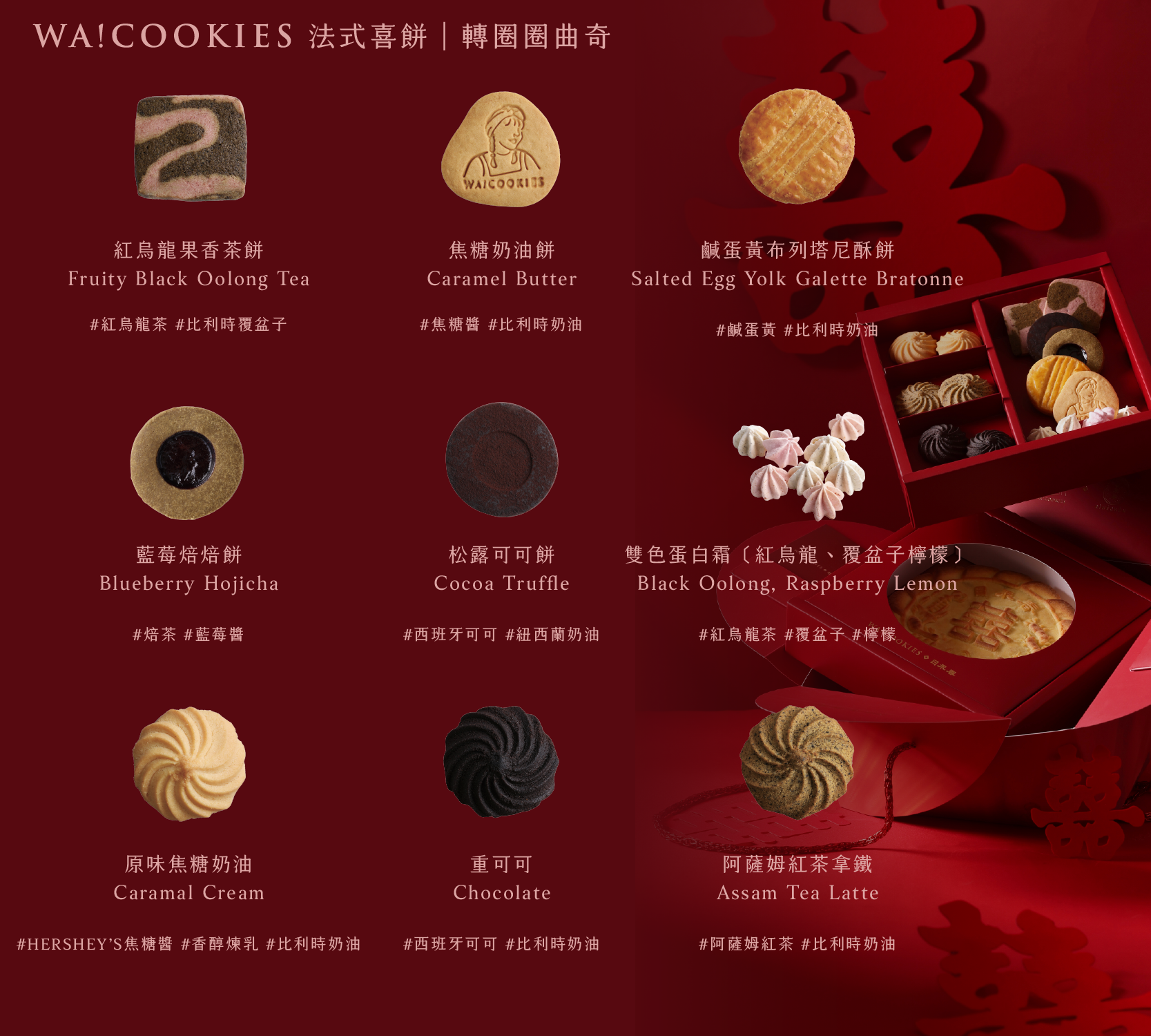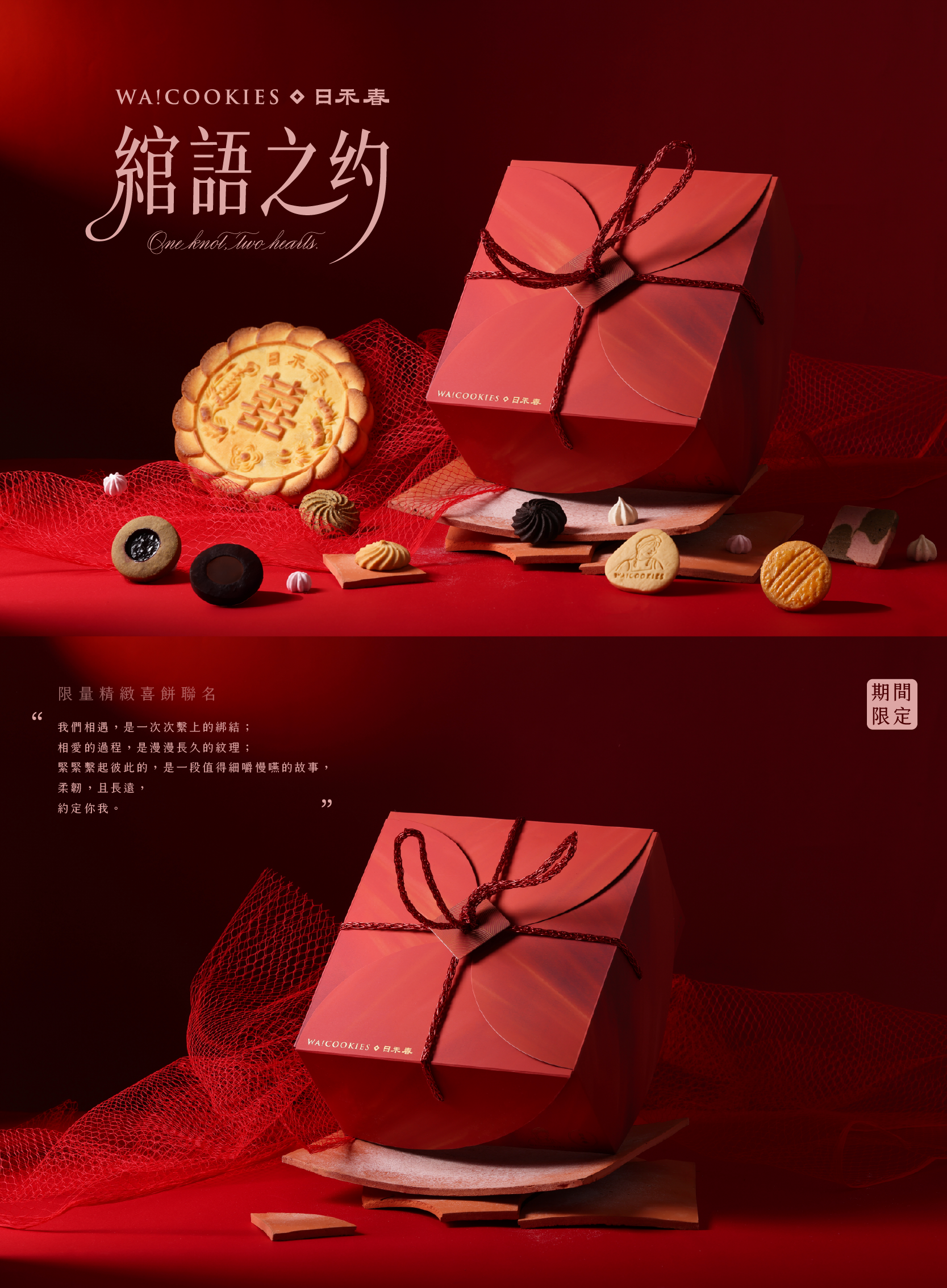 WA!COOKIES 首次攜手傳統糕餅品牌「日禾春 RìHÉCHŪN」推出中西式結合喜餅禮盒《綰語之約》,禮盒內含 WA!COOKIES 6 款法式喜餅、6 入轉圈圈曲奇,以及日禾春經典大餅 1 入(口味二擇一),20 盒起訂,請洽 FB 客服,或點選下方聯絡我們。