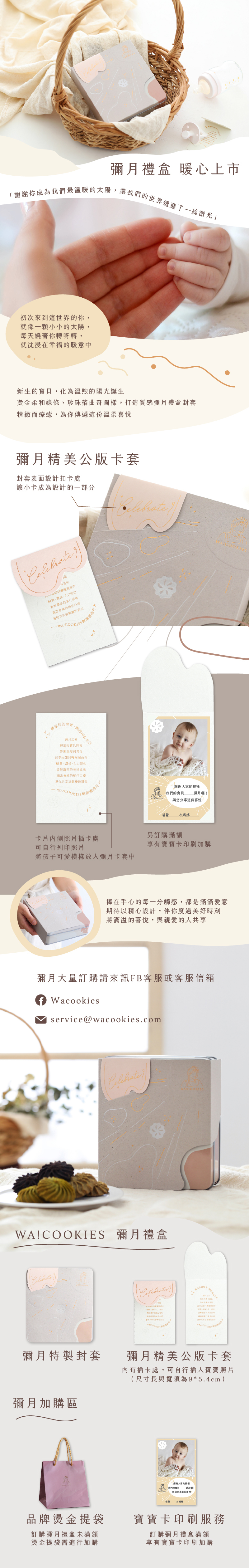 | ※ 彌月禮盒大量訂購滿額另享有優惠價,可再加購彌月寶寶卡,印製孩子可愛的模樣。 |